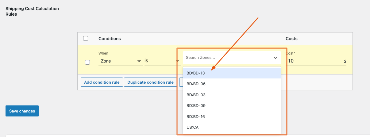 Example 1: Lets set a Shipping Condition such that if there are any order to be delivered to Bangladesh, Zone number 13, there will be an additional $10 Shipping Charge added.